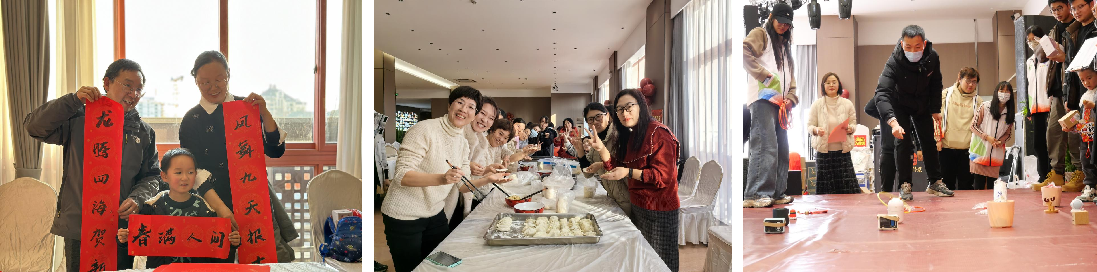 联欢会开始前,举办了“迎春送福 翰墨飘香”书法活动,把对新春的的祝福和未来的期许融入笔墨中;“饺香四溢 情暖农院”包饺子活动,老师们互相切磋,大显身手,各式各样的花式饺子迅速出炉;“套出欢乐 圈住幸运”趣味套圈活动,小小的套圈满场纷飞,带着期望飞向目标。活动现场温馨热闹,处处洋溢着“家”的味道。