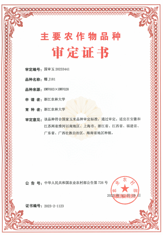 浙江农林大学现代农学院赵光武教授团队自主选育的玉米新品种“糯J181”通过审定,审定编号为国审玉20233441。该品种具有早熟广适、高产稳产、品质优良等特点,兼备鲜食与深加工优势,有望成为未来主推玉米新品种。