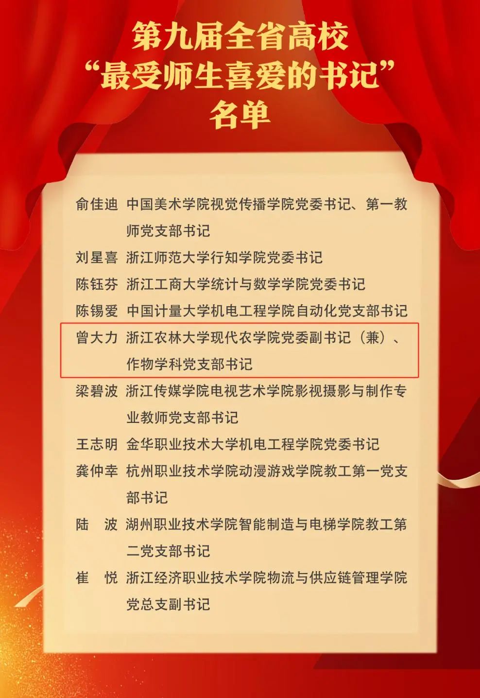 喜报!学院院长、作物学科党支部书记曾大力同志荣获全省高校“最受师生喜爱的书记”称号