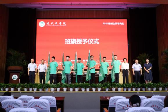 会上,副院长宣读了《2025级新生班主任聘任决定》和《2025级新生班主任助理、驻班党员聘任的通知》文件,出席领导为全体新生班主任、班主任助理、驻班党员颁发了聘书。学院领导为新生代表佩戴校徽、赠送了《袁隆平的世界》《自我突围》《红种子·榜样力量》等书籍,并为新生班级举行了班旗授予仪式。
