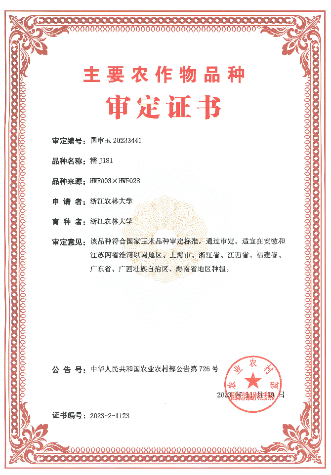 近日,农业农村部发布公告(第726号),经第五届国家农作物品种审定委员会第三次会议审定,由我院赵光武教授团队自主选育的玉米新品种‘糯J181’通过审定,审定编号为国审玉20233441,该品种为我校第一个通过国家审定的玉米新品种。