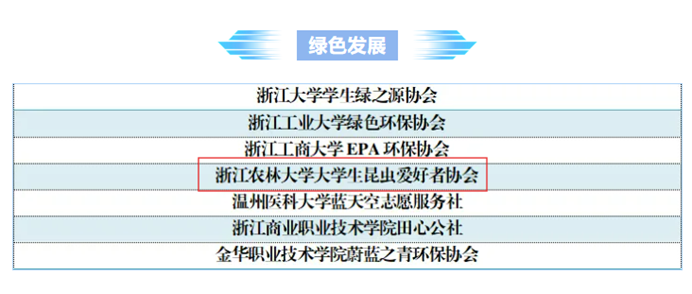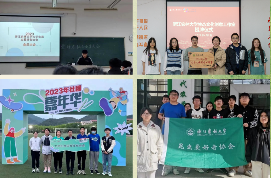 浙江农林大学大学生昆虫爱好者协会成立于2011年,目前是学校五星级社团和优秀社团。社团深入贯彻和践行学校“生态育人 育生态人”理念,本着文化、实践、创新、交流的宗旨,突出昆虫科普文化传播、社会公益和科技服务的大学生绿色发展类社团。