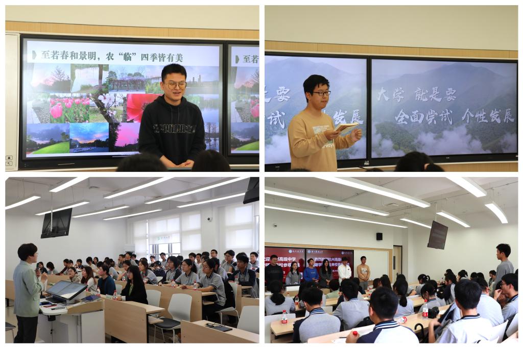 在智慧教室,宋春春为来校师生作招生宣传讲座,向师生们详细介绍了学校的基本情况,解读了我校发展历程、办学理念,介绍了学院专业优势、培养目标等情况;我院优秀毕业生代表胡佳铭及杭高本部毕业学长王佳瑞分享了美好的大学生活和充实的学习科研经历,支部学长学姐为师生进行答疑交流。