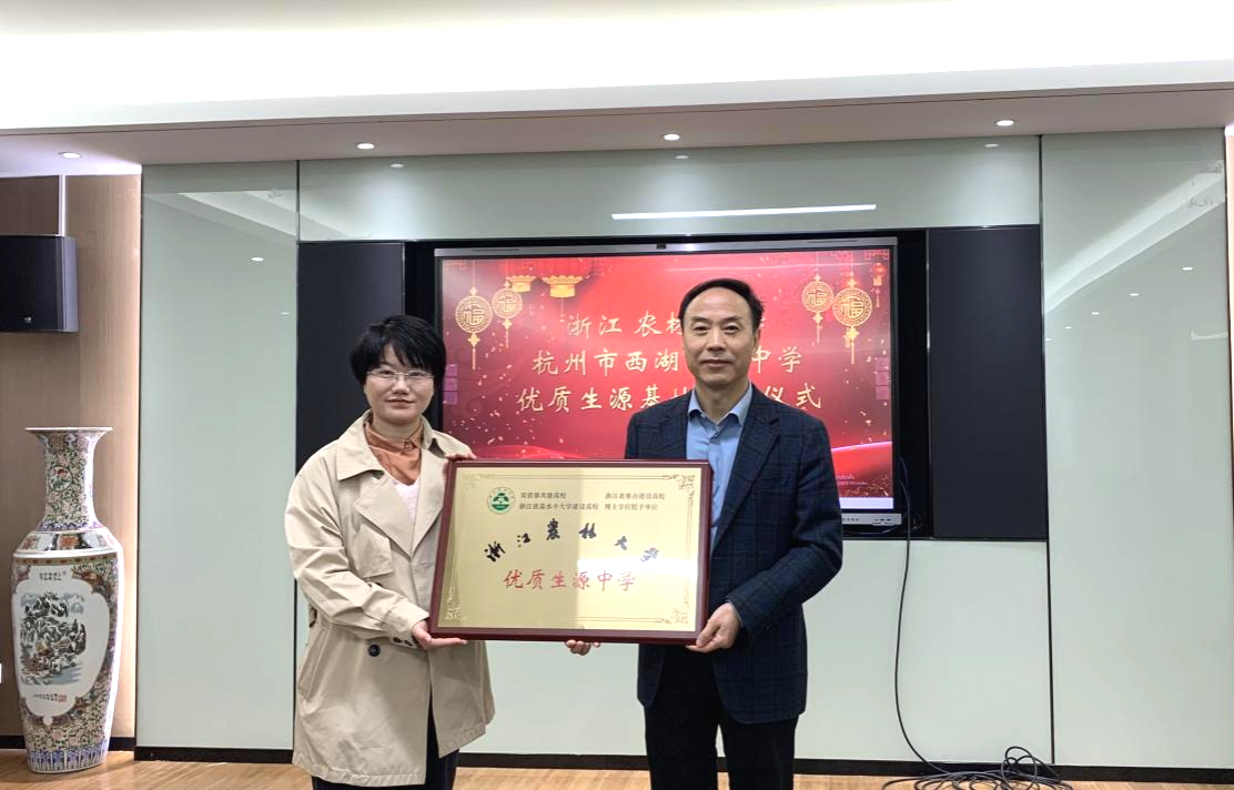当天上午,浙江农林大学“优质生源基地”授牌仪式在杭州市西湖高级中学行政楼一楼会议室举行,双方教师代表和优秀校友共同见证了授牌仪式。西湖高级中学校长陈柏良介绍了学校办学理念、办学历史和校园文化,院党委副书记宋春春分享了我校历年招生情况和特色专业,并提出今后双方要进一步深化联系,加强交流,“牵手”共促学生成长成才,“共建”助推两校更好发展。