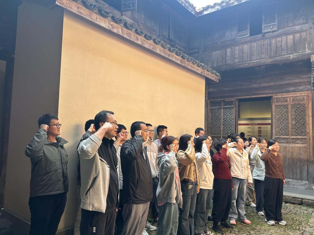 教师们参观了高虹新四军纪念馆,这里是新四军苏浙军区第一纵队第一支队驻地之一,也是杭州市党员教育示范基地。纪念馆设有“浙西烽火”、“天目反顽”、“军民齐心”、“高虹丰碑”四大主题展区,系统呈现了苏浙地区抗日武装斗争的历史脉络。展板、遗物、文献、历史照片和场景复原相互映衬,呈现了新四军部队在艰苦环境中与日本侵略者及顽固派斗争的壮烈画面。参观结束后,全体教师党员在纪念馆中庭整齐列队,面对鲜红党旗重温入党誓词。铿锵有力的誓词让每位党员再一次接受精神洗礼,进一步坚定了投身教育科研事业的初心与使命。