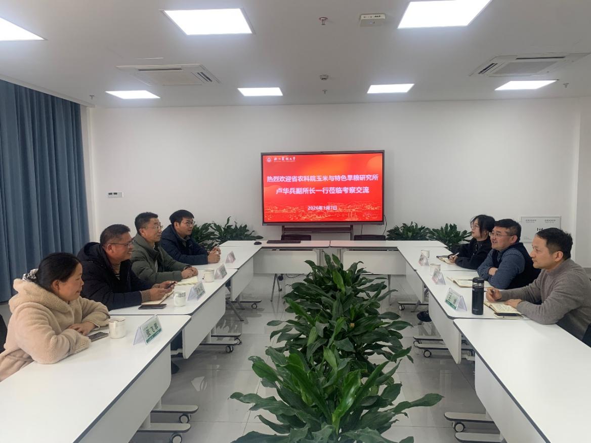 1月7日,浙江省农业科学院玉米与特色旱粮研究所卢华兵副所长、吕学高副主任、张飞萃、徐磊一行4人到学院进行考察交流,学院副院长赵光武、学术副院长王洋以及教师代表赵娟参加座谈会。