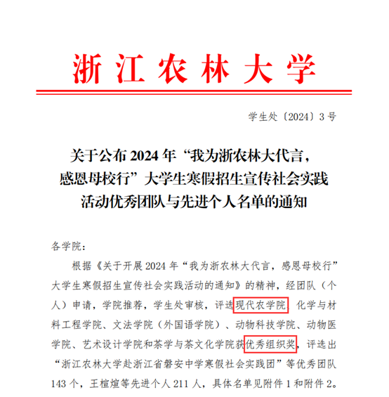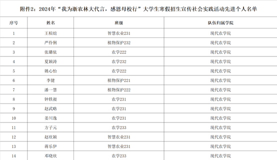 为增强在校大学生的社会实践能力,将学校的教学理念、办学特色、招考信息等带入中学,提升高中学生、家长对我校涉农专业的认识,进一步提升学校社会影响力和社会声誉,鼓励更多优秀学子报考我校。现代农学院积极组织开展2024年“我为浙农林大代言,感恩母校行”寒假社会实践招生宣传活动。