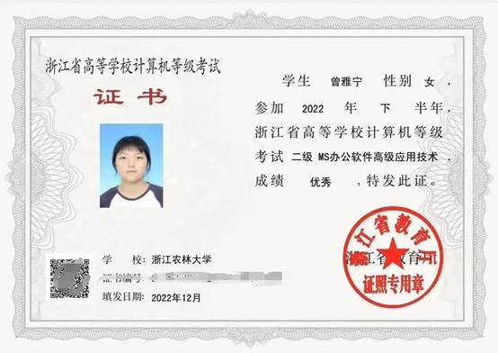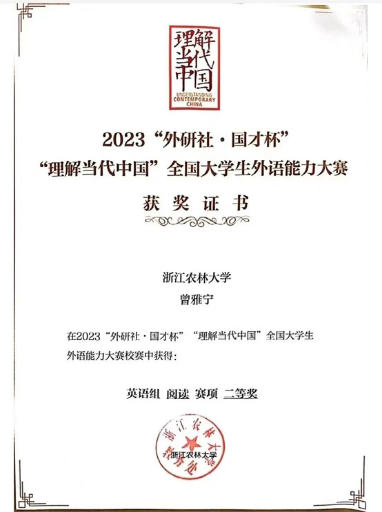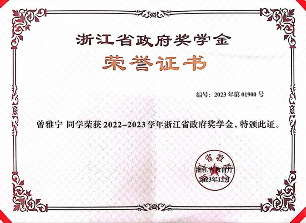 在学习上,曾雅宁态度端正,认真制定学习目标并严格执行,积极参加各类竞赛,在2022-2023学年取得专业第二的成绩和学校“五好学生”称号,并取得了英语四六级、计算机二级和普通话证书。同时,她利用暑假时间提前进入实验室,参与科研实验,提高自己的科研能力。“在该奋斗的岁月里,对得起每一寸光阴。于高山之巅,方见大河奔涌于群峰之上,更觉长风浩荡。”她坚信,跨出去的每一步都是未来的基石和铺垫。