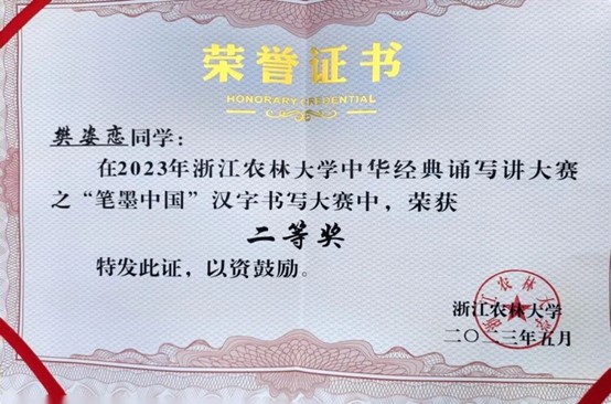 2023年浙江农林大学中华经典诵写讲大赛之“笔墨中国”汉字书写大赛二等奖