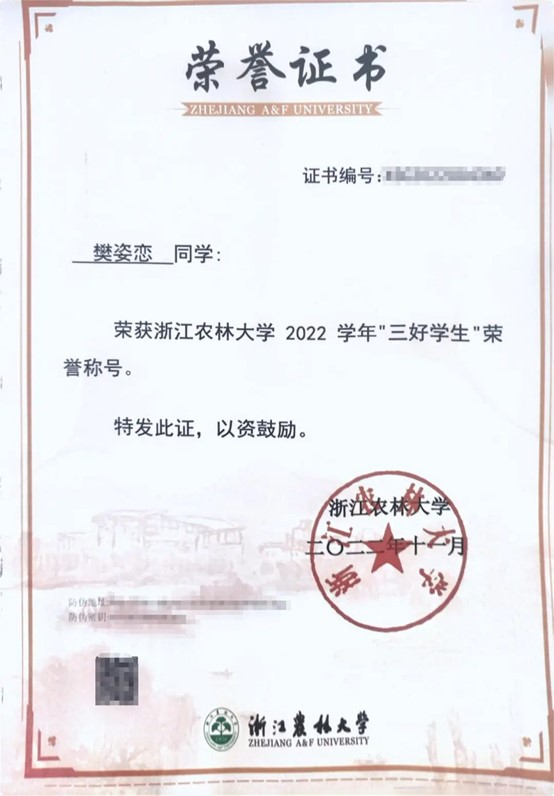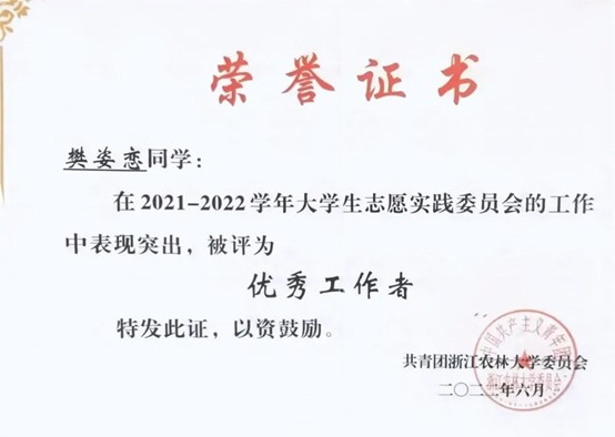 努力尝试,突破自我。除了书本上知识的学习,她积极参加各类比赛,尝试新的领域,不断突破自我。她的表达能力与展现能力并不突出,于是她积极把握机会,在比赛中锻炼自己。从大一刚开学参加学院“我与农学之缘”演讲比赛,到后来站上临安区新时代文明实践志愿服务项目大赛的演讲讲台,她在不断磨练中成为了更好的自己。她相信,竞赛的结果固然重要,但更重要的是为之奋斗的汗水以及在这段旅途中的收获和成长。