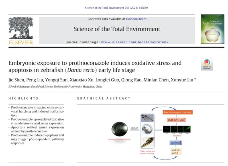 近日,国际期刊《Science of the total environment》(一区TOP期刊,IF=6.551)以《Embryonic exposure to prothioconazole induces oxidative stress and apoptosis in zebrafish (Danio rerio)early life stage》(https://doi.org/10.1016/j.scitotenv.2020.143859)为题,在线发表我院植物保护专业本科生研究论文。论文以浙江农林大学为署名单位,植物保护2017级本科生沈婕为第一作者,刘训悦副教授为通讯作者,本科生刘鹏、徐笑笑、郭龙飞、陈敏兰参与了相关研究。