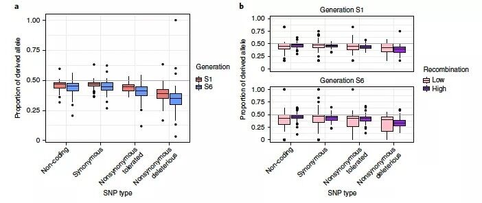 研究团队利用11个地方品种的六个世代的自交系,探究了自交过程中玉米全基因组遗传清除的动态变化。研究发现,在玉米自交过程中,杂合的有害单核苷酸多态性位点更易从基因组中丢失。在高重组率的染色体序列区域,重组可导致与连锁的变异位点的解偶联以增加选择效率,进而致使dSNPs丢失的速率更快。但是,玉米在自交过程中,其杂合度减少的实际速率(35~40%/代)要慢于预期(50%/代),这可能反映出基因组中普遍存在着联合超显性。研究还发现,随着自交代数的增加,3个玉米地方种(MR01、MR08和MR18)的基因组由于大量转座元件和染色体钮被清除而显著减小;这些品种在短短几个世代内平均减少了398 Mb的基因组序列,这相当于每个品种丢失了3个拟南芥基因组。对于那些含有更多转座元件和染色体钮的大基因组玉米品系来说,其发生基因组序列丢失的可能性越大。