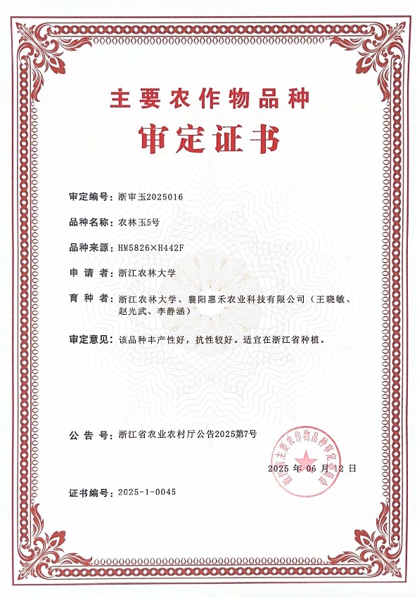 近日,浙江省农业农村厅发布公告(2025第7号),由我院种子科学与技术团队自主选育的玉米新品种‘农林玉5号’通过浙江省农作物品种审定,审定编号为浙审玉2025016。